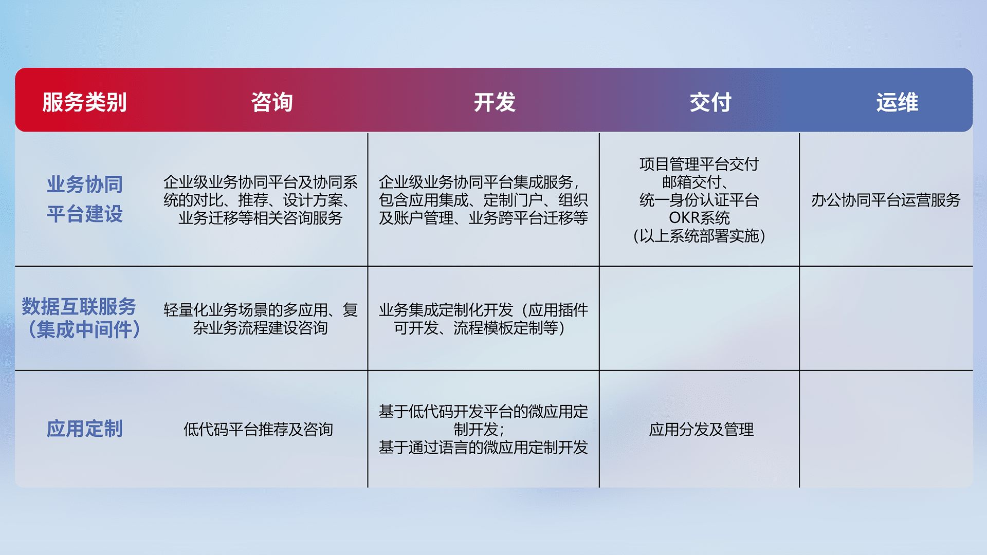 针对钉钉、、、、企微、、、IDaas等平台级产品提供产品的规划、、、方案、、、、交付、、、定制化开发等服务,,,实现如统一协同办公、、、、智能客户服务、、、、混合会议管理、、、智能数据查询、、、、等业务场景,,,实现数字化转型。。。